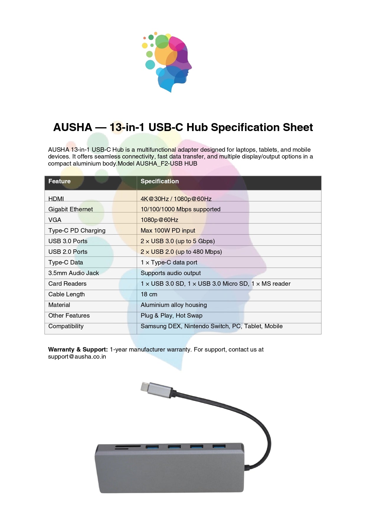 【ALL IN ONE USB C HUB】 Expand your device’s connectivity with this 13 in 1 docking station, featuring a wide range of ports to meet all your needs: 1x 4K HDMI, 1x Full HD VGA, 2x USB 3.0, 2x USB 2.0, SD/TF/MS card readers, RJ45 Gigabit Ethernet, a 3.5mm audio/mic combo jack, and a 100W Power Delivery port to charge your devices while in use.