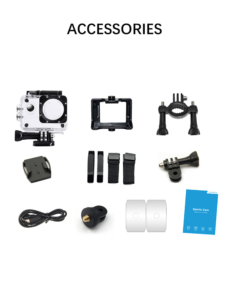 1x Action Camera/ 1x 900mAh Battery/ 1x Waterproof Case/ 1x Bicycle Stand/1x Multi functional Mount Clip/ 2x Clip/ 1x Helmet Mounts/ 1x Bandages/1x USB Cable/ 1x AC Charger/ 1x Lens Cloth/ 1x Quick Reference Guide