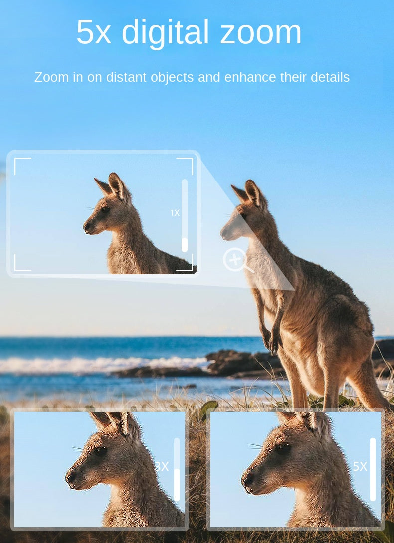 The built-in 5× digital zoom allows users to magnify distant objects for closer inspection without physically moving closer. This feature is especially useful for observing wildlife, identifying objects at a distance, or monitoring large open areas. Zoom levels are smooth and easy to control, ensuring stable viewing even during extended observation sessions.