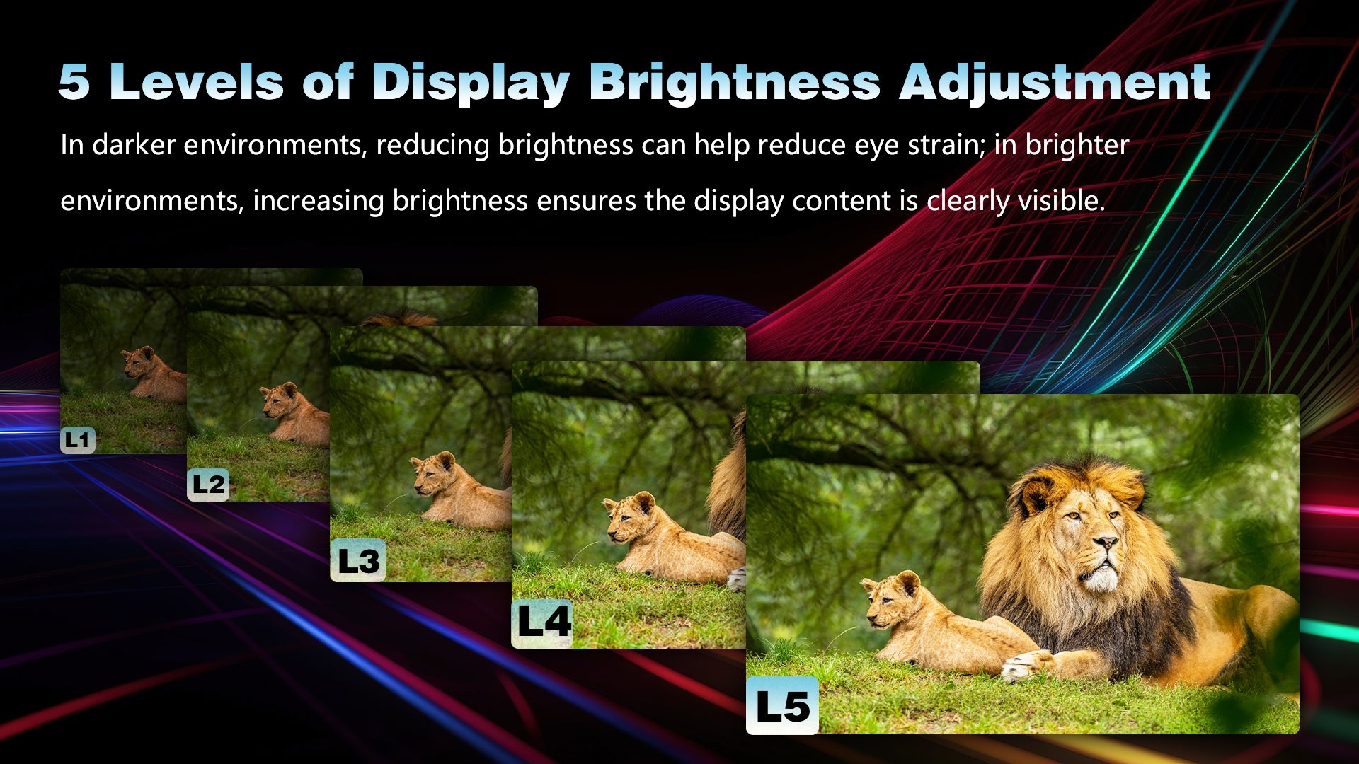 The display supports five levels of brightness adjustment, enabling users to adapt screen intensity based on ambient light conditions. Lower brightness settings help preserve night vision in dark environments, while higher settings ensure visibility in brighter surroundings.
