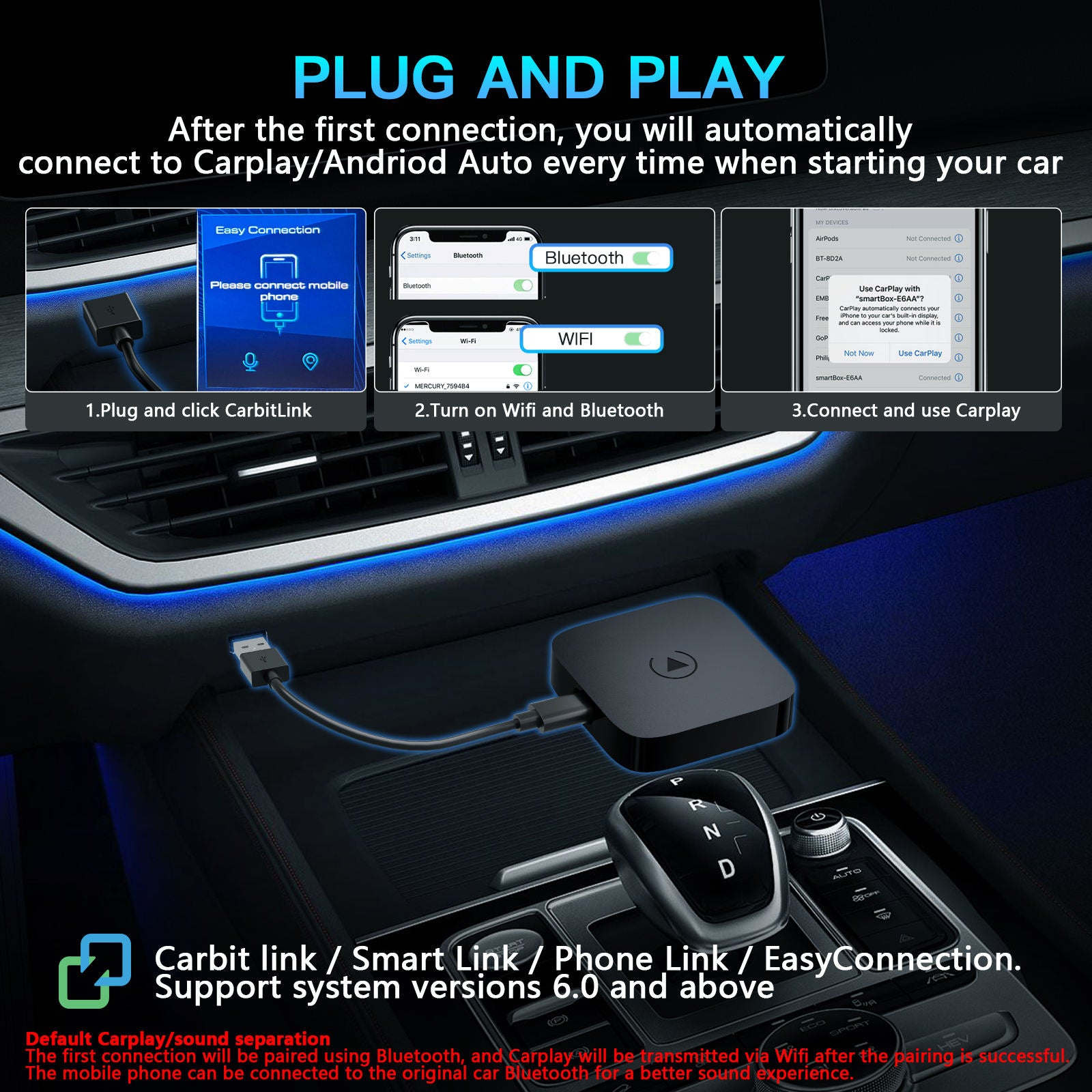 This compact yet powerful adapter uses dual Bluetooth and Wi-Fi technology to create a fast, stable, and completely wireless connection between your smartphone and car’s infotainment system.