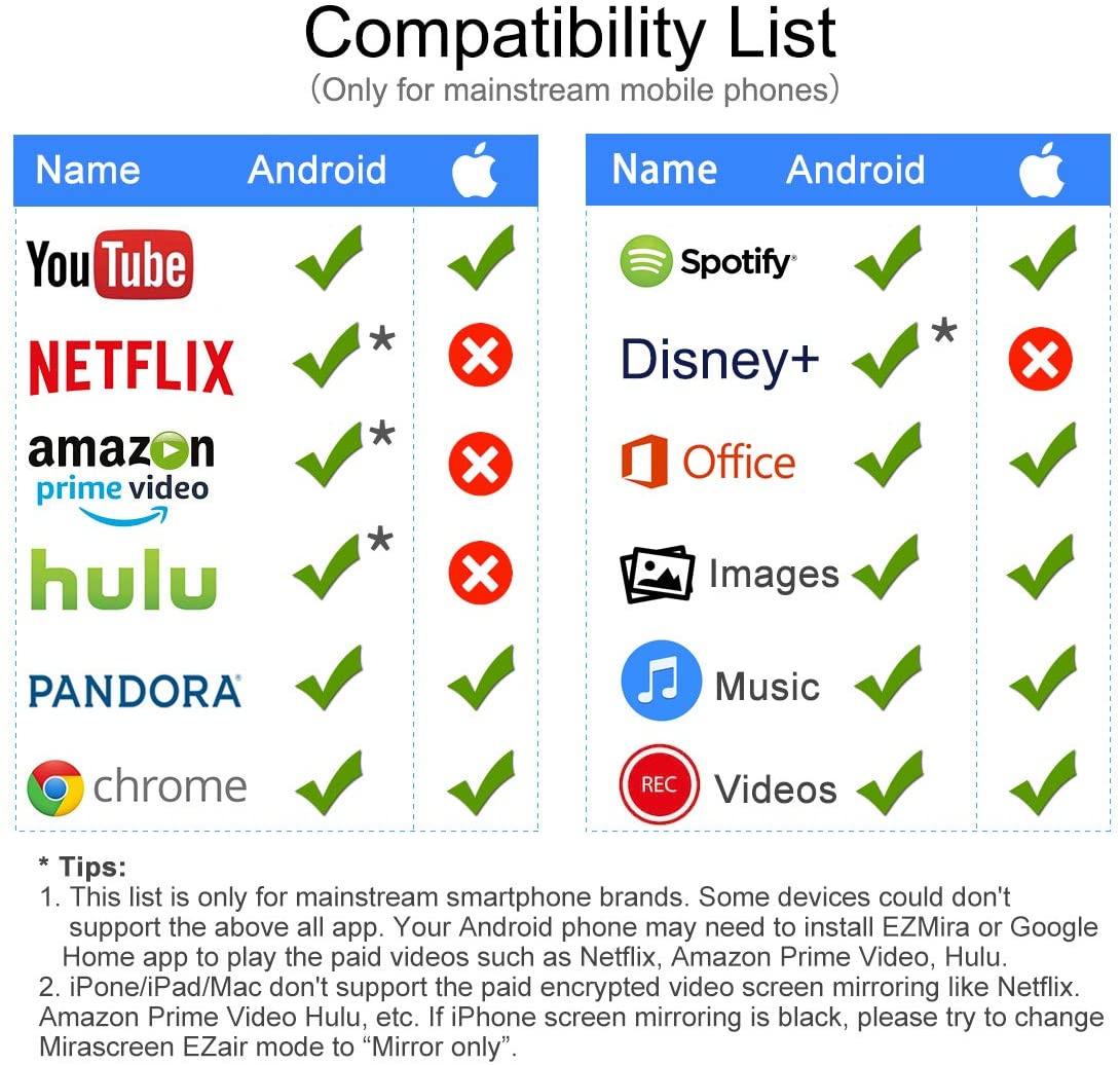 Support Smart Phones, PC,Video apps to TVs, projectors and Vehicle devices.