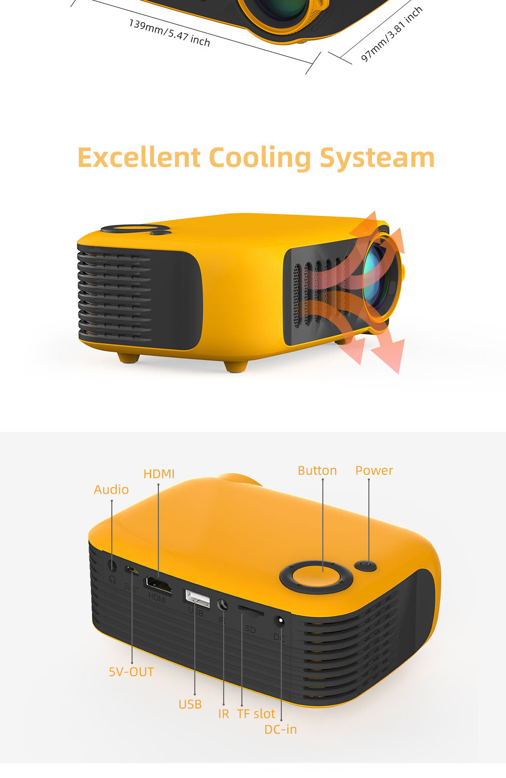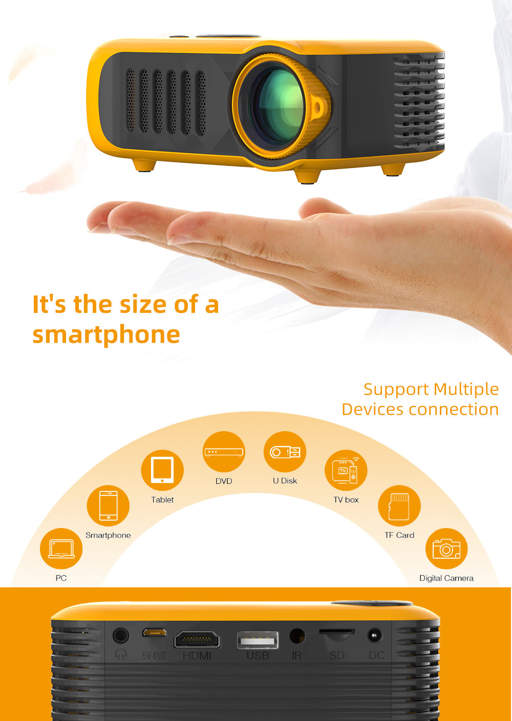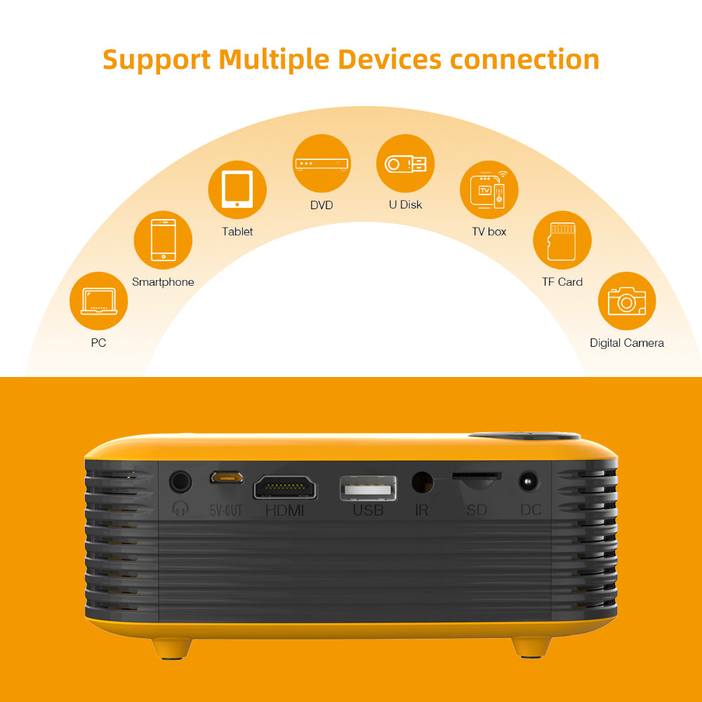 Our mini handheld projector supports 1080P, 50000+ lamp life, comes with audio control, sensitive operation.