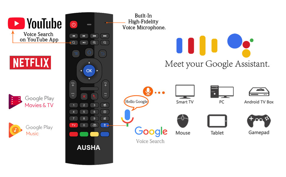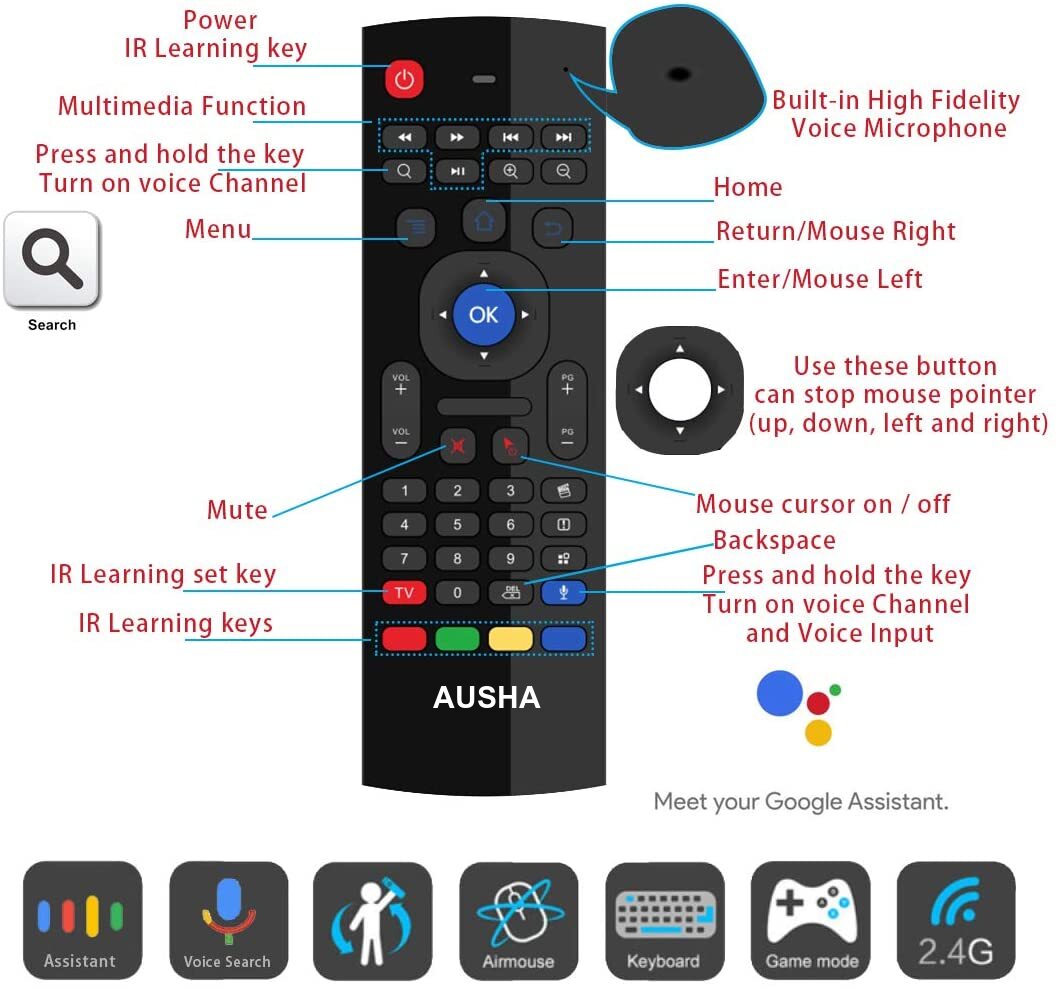 The remote has 5 IR learning keys that can be programmed to learn some basic functions of TV remote, which are the POWER and 4 color buttons at the button of air mouse.