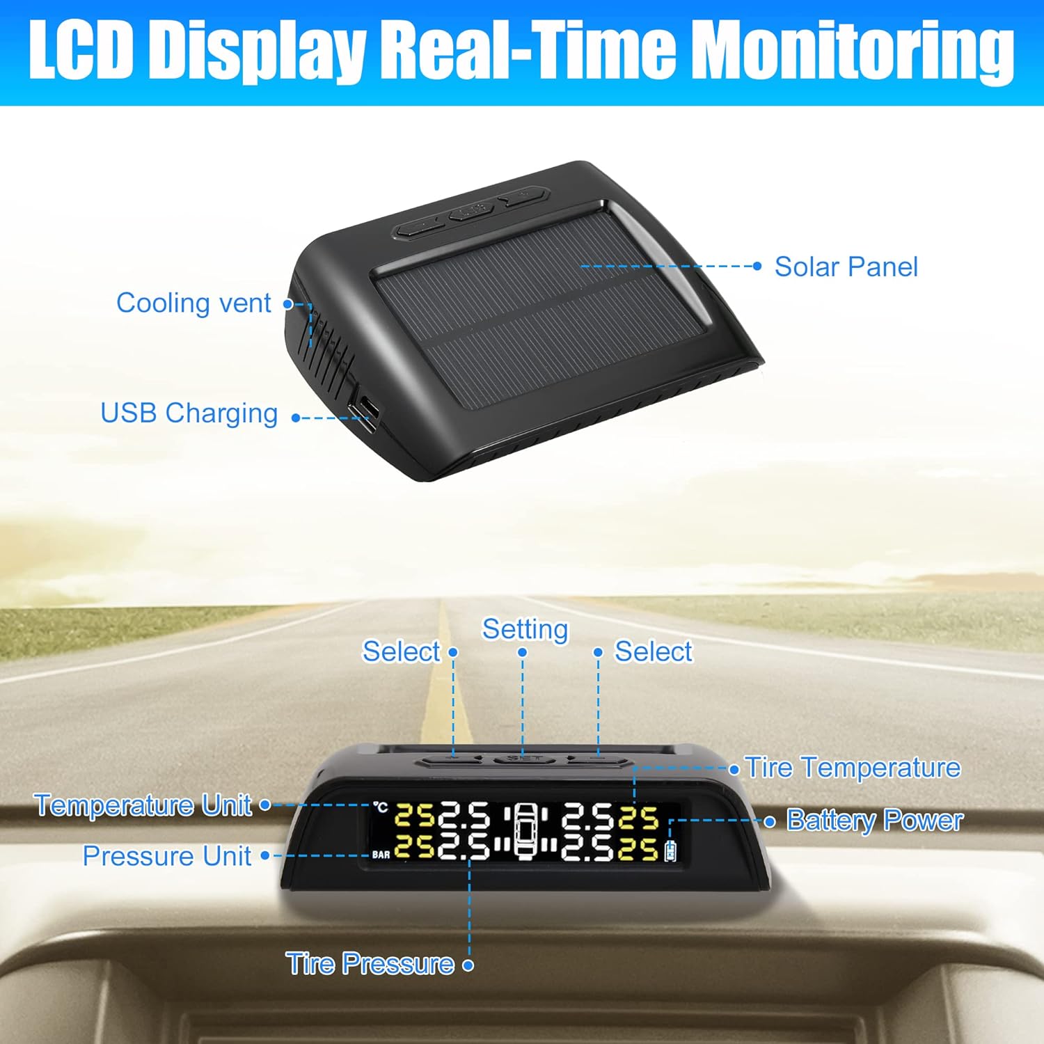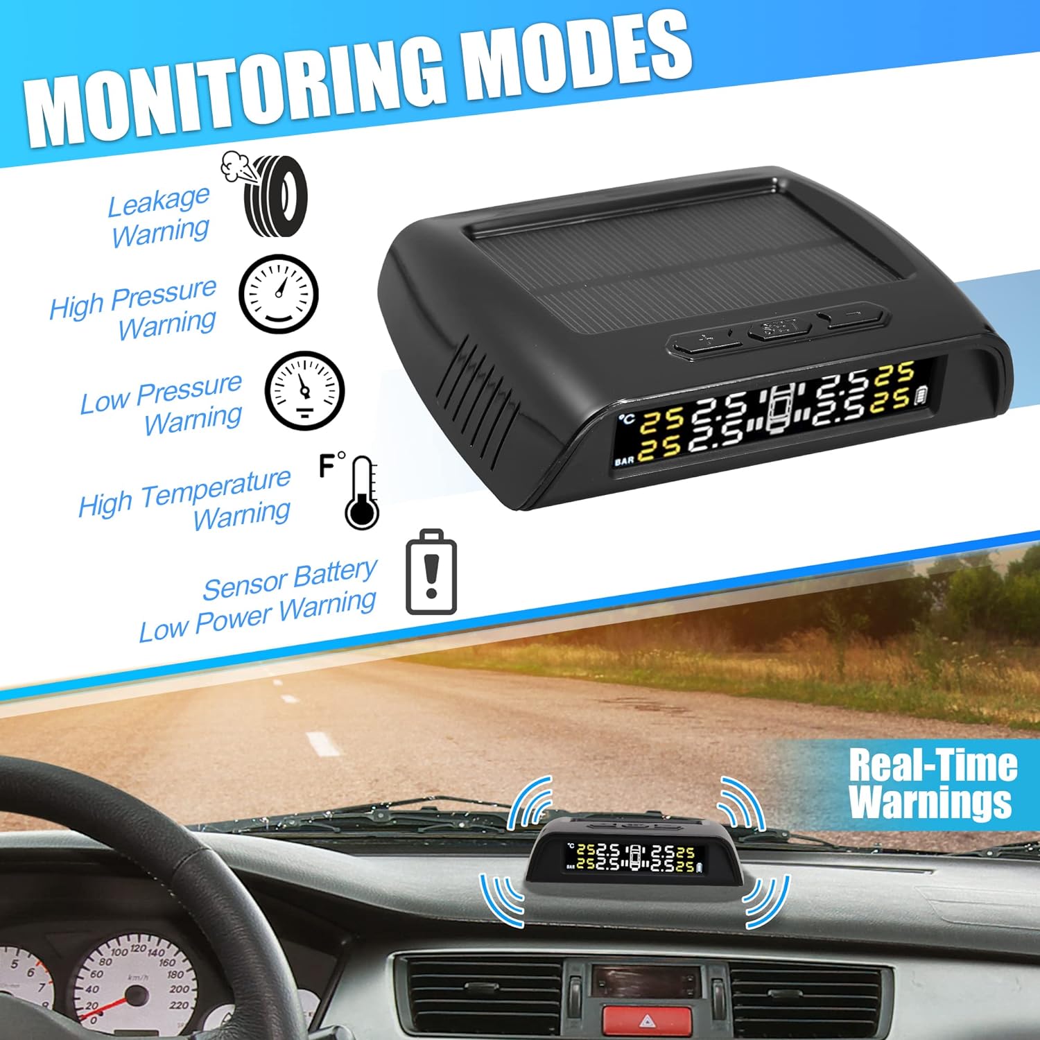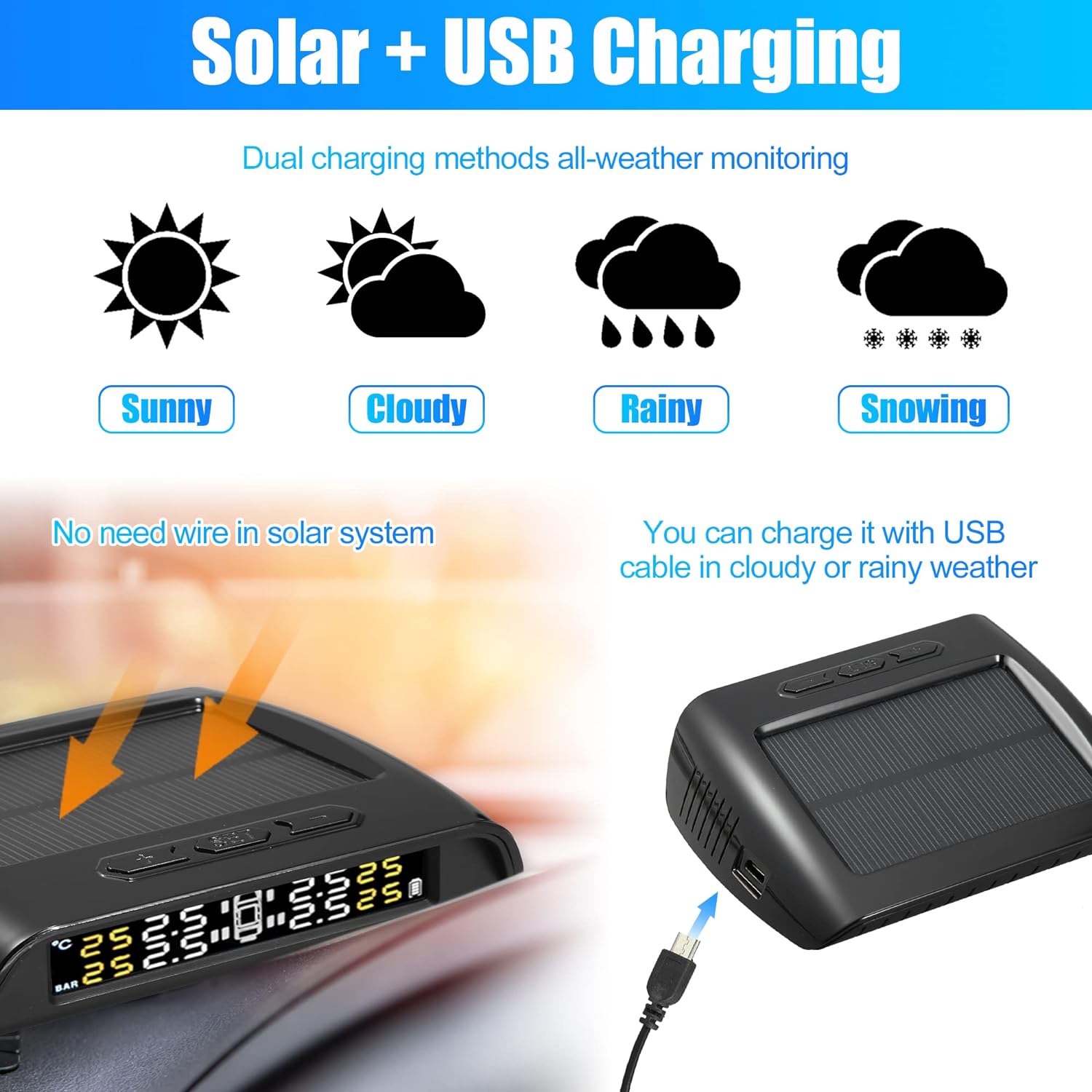 【DUAL CHARGING METHODS】: Our TPMS is equipped with efficient solar panels and a USB port for charging. You can count on it to work continuously, whether you have sunlight or not, making it an eco-friendly and reliable solution.